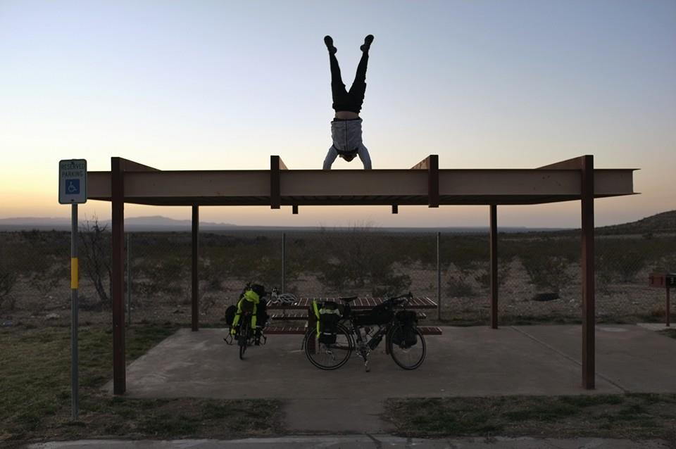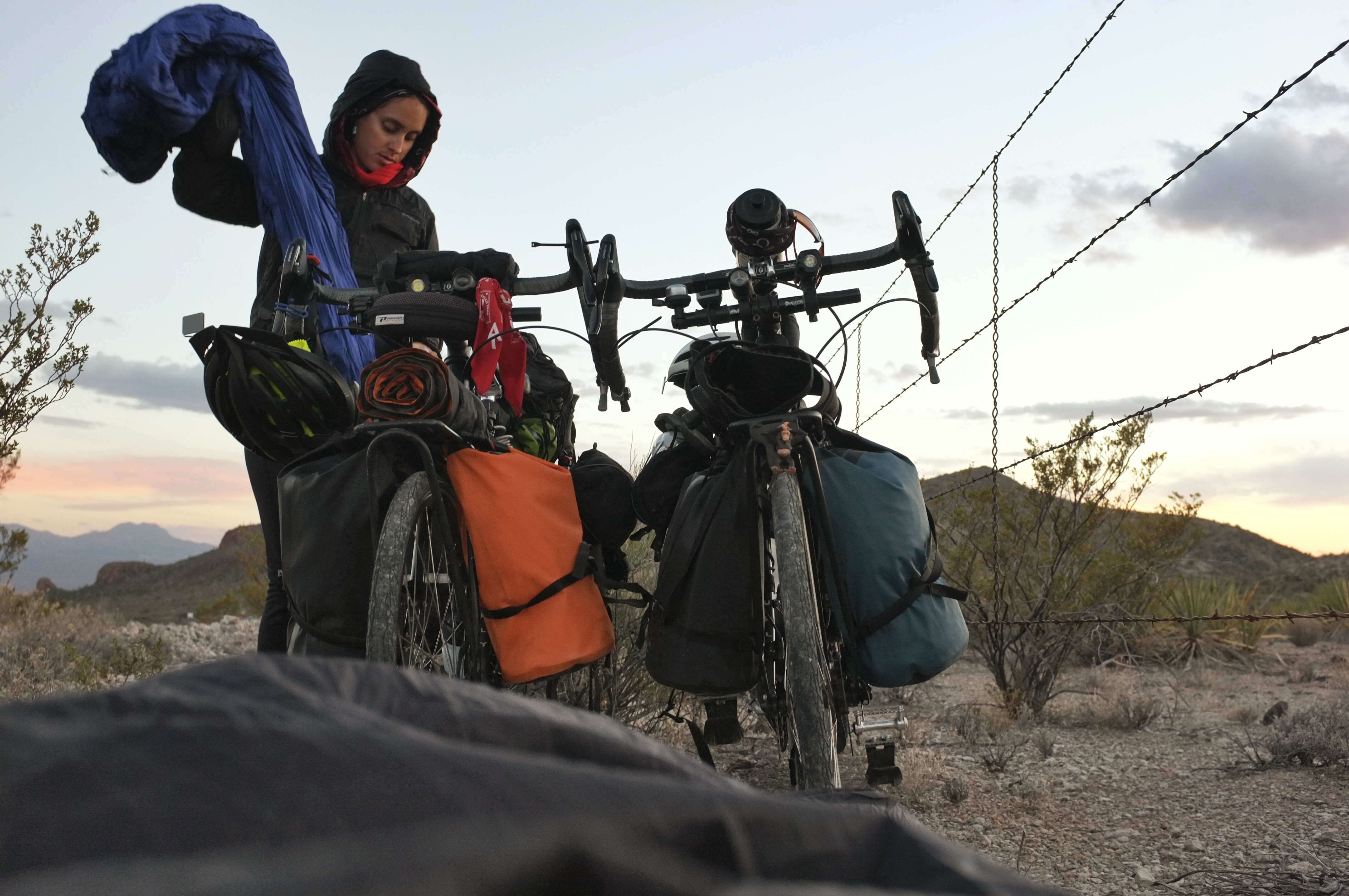 — In southern California on the border of the U.S. and Mexico, we were traveling by interstate and found ourselves in precisely the scenario described above. We scouted for some bushes that seemed to hide our existence from the traffic, laid the bikes down, our sleeping bags out, and our bodies down ready to snooze. At around 1:30 AM, I awoke to the truest fear in David’s voice; panicked, exclaiming, “Oh my god! Oh my god! What the f*@#! NO!” I look over and am instantly jolted into fear, thrusting up, trying to see what was attacking him because surely, with all of the commotion and fright, something must be hurting him. Unable to escape from my bivy which was fully zipped like a coffin barrier, and utterly confused, I started to panic and let out a chilling, nightmarish scream (that I still can’t believe came out of my mouth). Then I heard rustling in the bushes around us, my hands feebly fumbling with my bivy zipper until I could open up a tiny hole to poke my face through. “It’s ok! It’s ok…”, David’s shaky voice hesitatingly trying to sound convincing. Then we see figures popping up out of the bushes, silhouetted in the full moon sky. The figures started gently making their way around our bicycles and bivied figures, then they bolted, arms flailing, due west into the well-lit night. Illegal immigrants. We were apparently sleeping on a popular immigrant footpath.