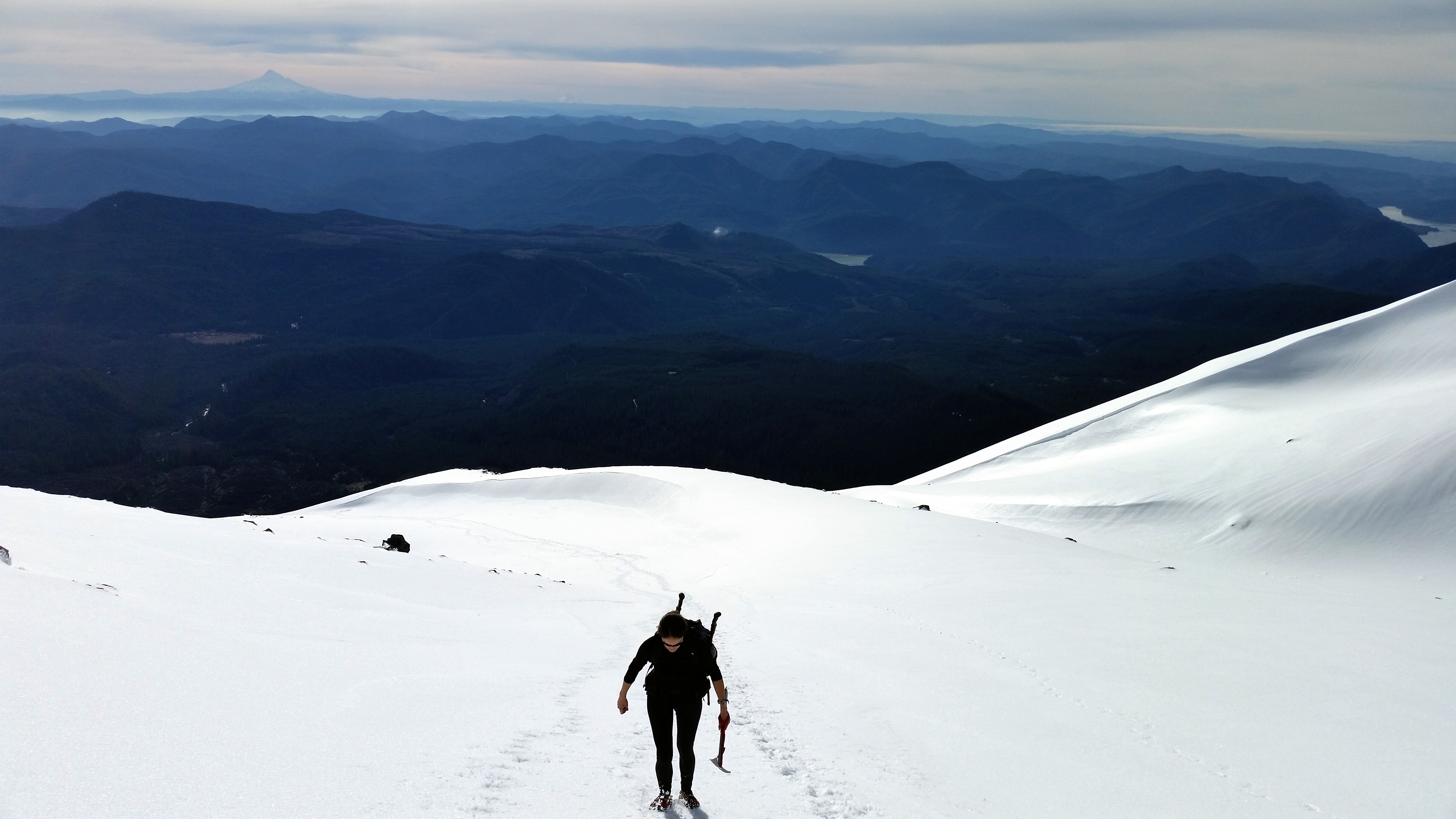 We woke at 6:30 and blearily brewed a thermos of coffee for the approach, had a bite, and set out. There was one other person there, probably an hour ahead of us. We made our way down the well-trodden path as the coffee worked it’s magic on our brains and our muscles ached from the climb the day before.   After several miles we turned out of timberline, across Swift Creek and onto the rivers of rocky lava that lead to the summit, known as the Worm Flows. We followed a rocky spine for several hours before reaching snowline, where we threw our Kathoola Microspikes on over our trail runners. After the first pitch the climb became steep and opened into snowy chutes, so out came the boots and proper crampons. Clink, clank, chick, cssshhhh goes the sound of rented mountaineering gear against the silent slopes.