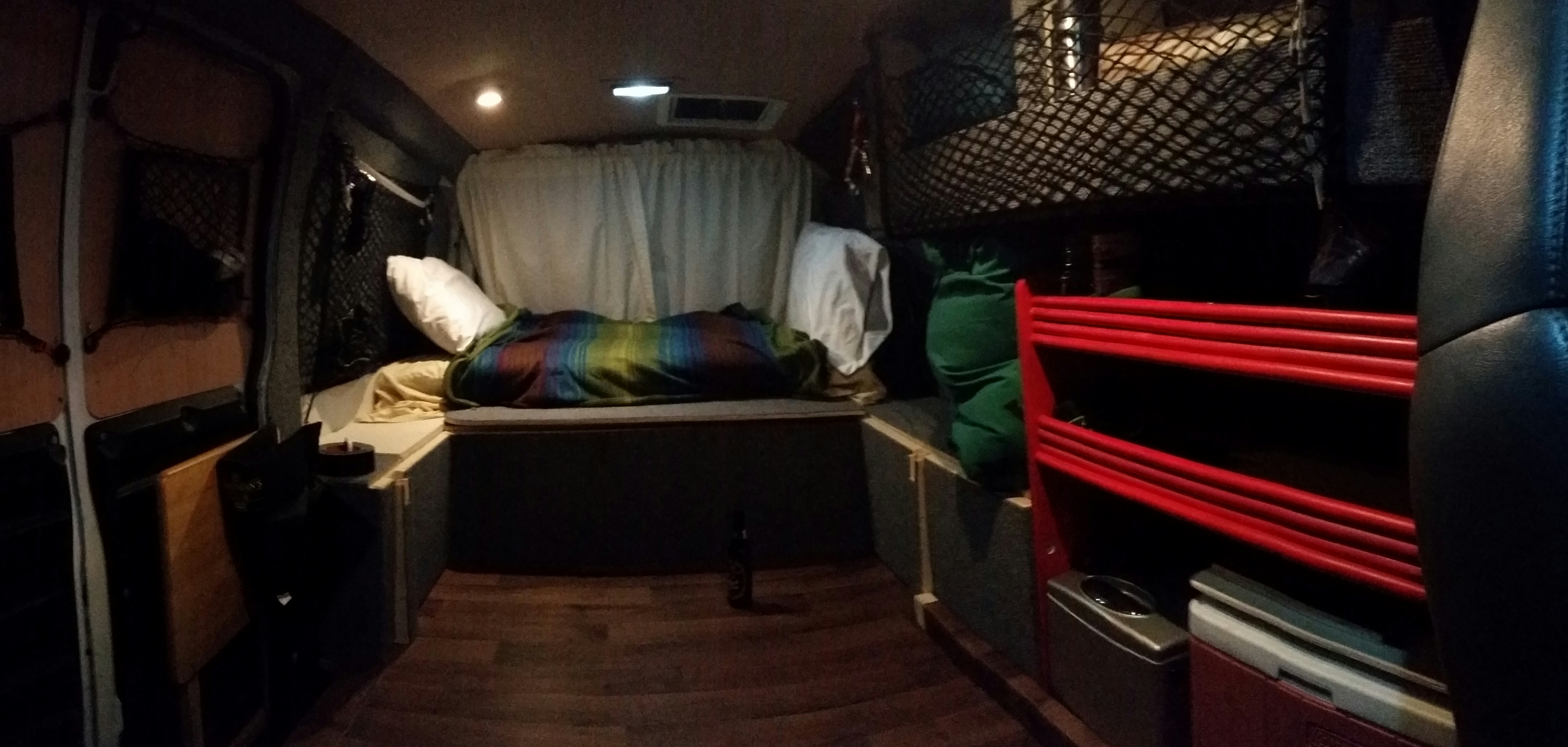 But where will you live?, the curious person might inquire. Easy answer: The insane home David sculpted for us out of a Kung-Fu master‘s contracting van. Chevy Express turned Adventure Mountain Mobile, David spent hundreds of laborious hours creating the van home we so lovingly named Van Occupanther (check out Midlake’s album using the same name).